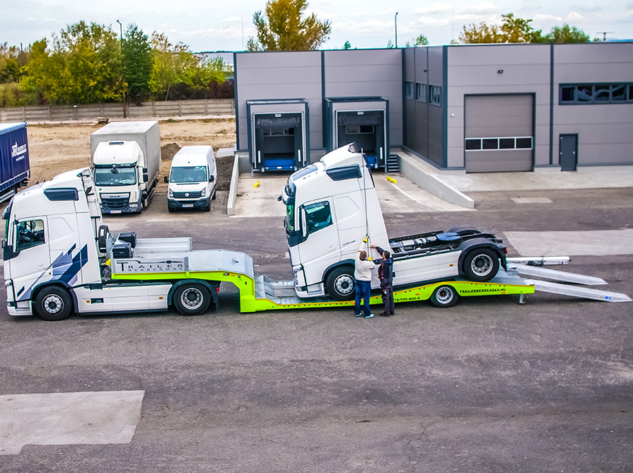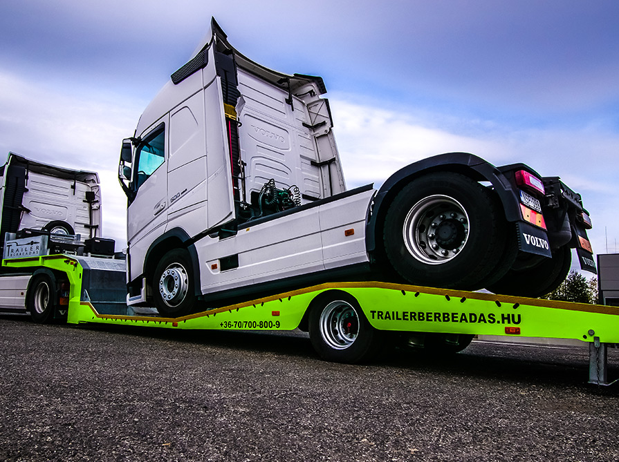 Elszállíthatja üzemképtelen nyergesvontatóját saját traktorával és kicserélheti a meghibásodott eszközét önköltségi áron. Béreljen mélybölcsős félpótkocsit.